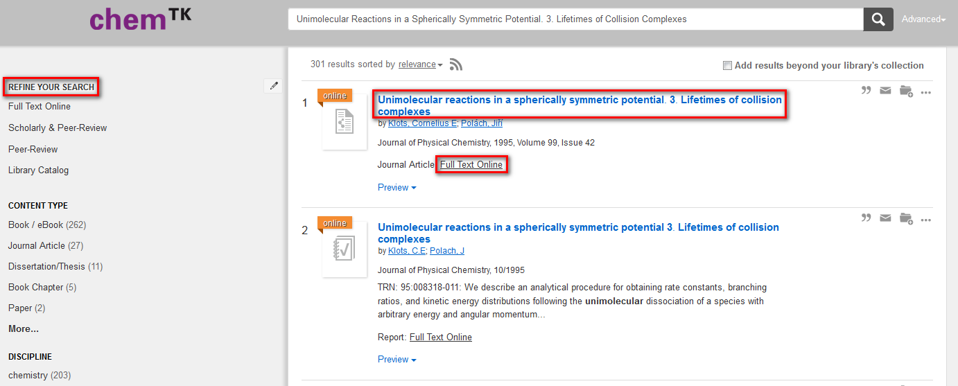 You can find information about the availability for each result. If the article is available, select its title or Full Text Online to open the SFX window. You will then see the item's availability for NTK/UCT/IOCB using the tabs. Select Full text available via.
